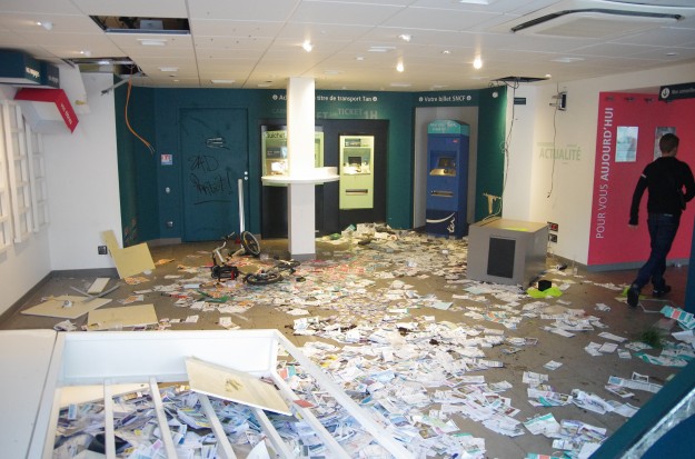 Par la suite sont arrivés ce qui pourrait ressembler à des « militants anarchistes », même si je répugne à employer le mot, pour les avoir entendu, je doute qu'ils en sachent beaucoup sur l'anarchie (les tracteurs postés devant les forces de l'ordre avaient déjà reculé, ils ne voulaient probablement pas qu'on les mêlent aux violences). Probablement la frange dure du mouvement (ceux qui ont tenu pendant des mois le terrain à défendre...), ils étaient là pour « casser du flic ». Ils ont traditionnellement déterré les pavés et commencé à bombarder les miliciens en armure. Ce ne sont pas ici des casseurs pas essence, l'utilité de la violence dans les mouvements contestataires est un autre débat. Mais ils ont rapidement été rejoints par des casseurs, qui avaient ramené marteaux, merlins, masques à gaz, voire scies. Ils ont, eux, commencé à démolir les vitrines. Les militants (les vrais) ont commencé à leur crier d'arrêter car ils décrédibilisaient le mouvement, mais ils n'ont fait que casser plus. Ils ont saccagé la boutique de la Tan (Transport de l'agglomération nantaise, NDLR) et lancé le mobilier sur les policiers (accompagnés, notons-le, de gendarmes, une belle preuve de coopération inter-services...). Mais ils avaient des armes, étaient clairement violents, j'ai entendu distinctement l'un d'eux dire « on s'en fout, nous, de l'aéroport ! On est là pour casser ! ».