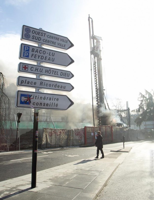 La police nous a donc laissés le champ libre pour les dégrader. Arrivés au bout de la rue de Strasbourg, on aperçoit une foreuse du chantier Vinci de réaménagement du square Mercoeur en feu, les gens applaudissent chaudement. On se dirige vers l'Hôtel-Dieu, à hauteur duquel le commissariat Olivier de Clisson, vide, est copieusement peinturluré.