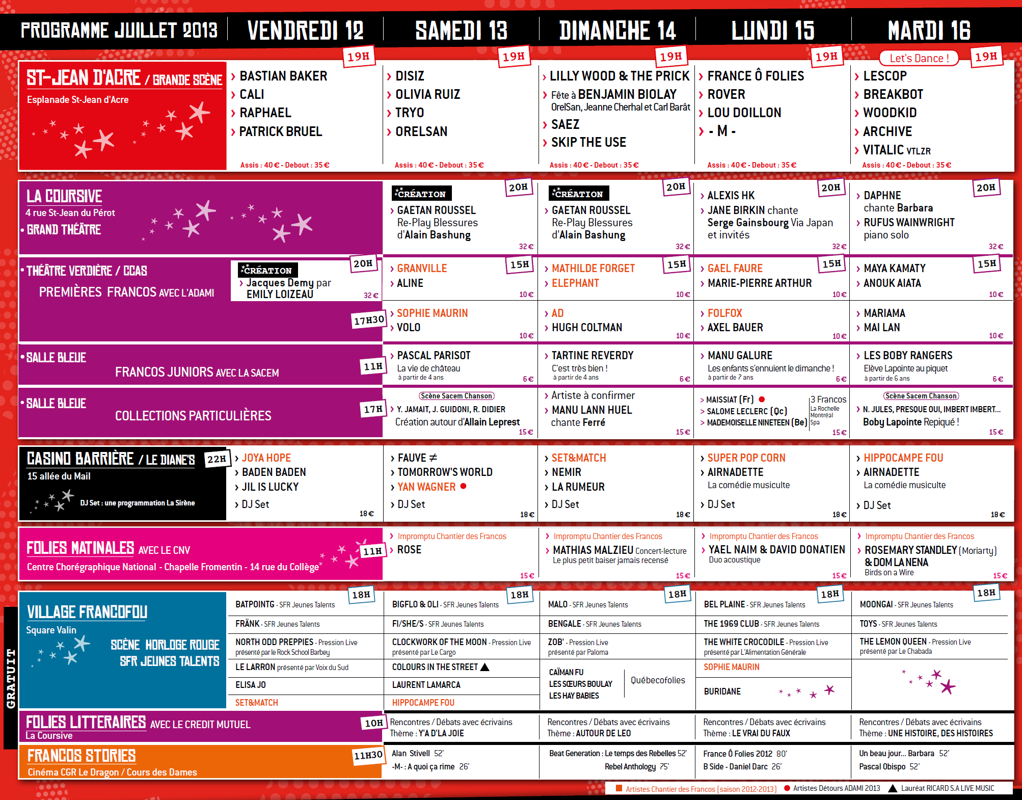 Scène Saint Jean d'Acre 19 h - Lescop, Breakbot, Woodkid, Archive, Vitalic VTLZR La Coursive - Grand Théâtre 20 h - Daphné, Rufus Wainwright Le teaser des Francofolies 2013