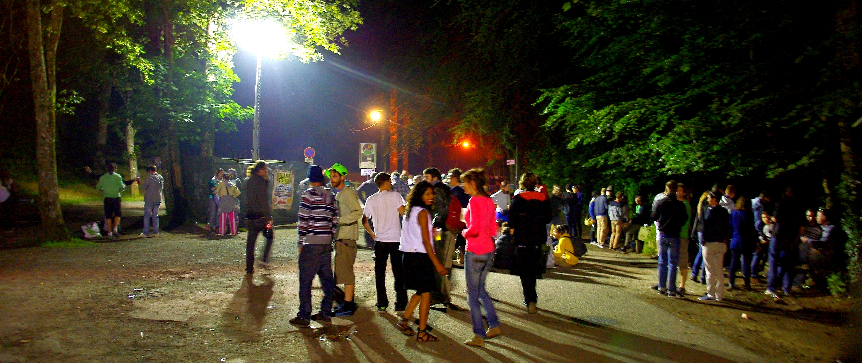 Sorti du bus, je retrouve Célia. Nous suivons la procession qui se forme, dans une atmosphère à la fois anxiogène et fascinante. Certains festivaliers titubent au son des basses, d'autres courent, des filles sont allongées dans le fossé, que d'aucuns utilisent comme urinoir. Tenues classes et bariolées se mélangent.
