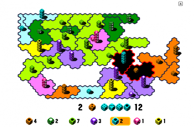 Capture d'écran de Dicewars. Tout le principe du jeu de strat. en trois graphismes : c'est là-bas que ça se passe. Quand on n'y connaît rien, on attaque par la configuration à deux joueurs, puis on progresse. Ah ça fonctionne bien, y'a des ptits bruits sympas, un peu de hasard, les différentes IA ne réagissent pas de la même façon tout ça.
